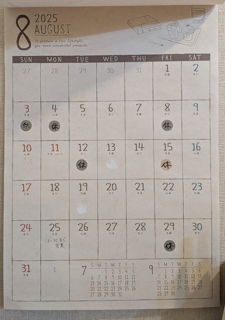 | 月 | 火 | 水 | 木 | 金 | 土 | 日 |